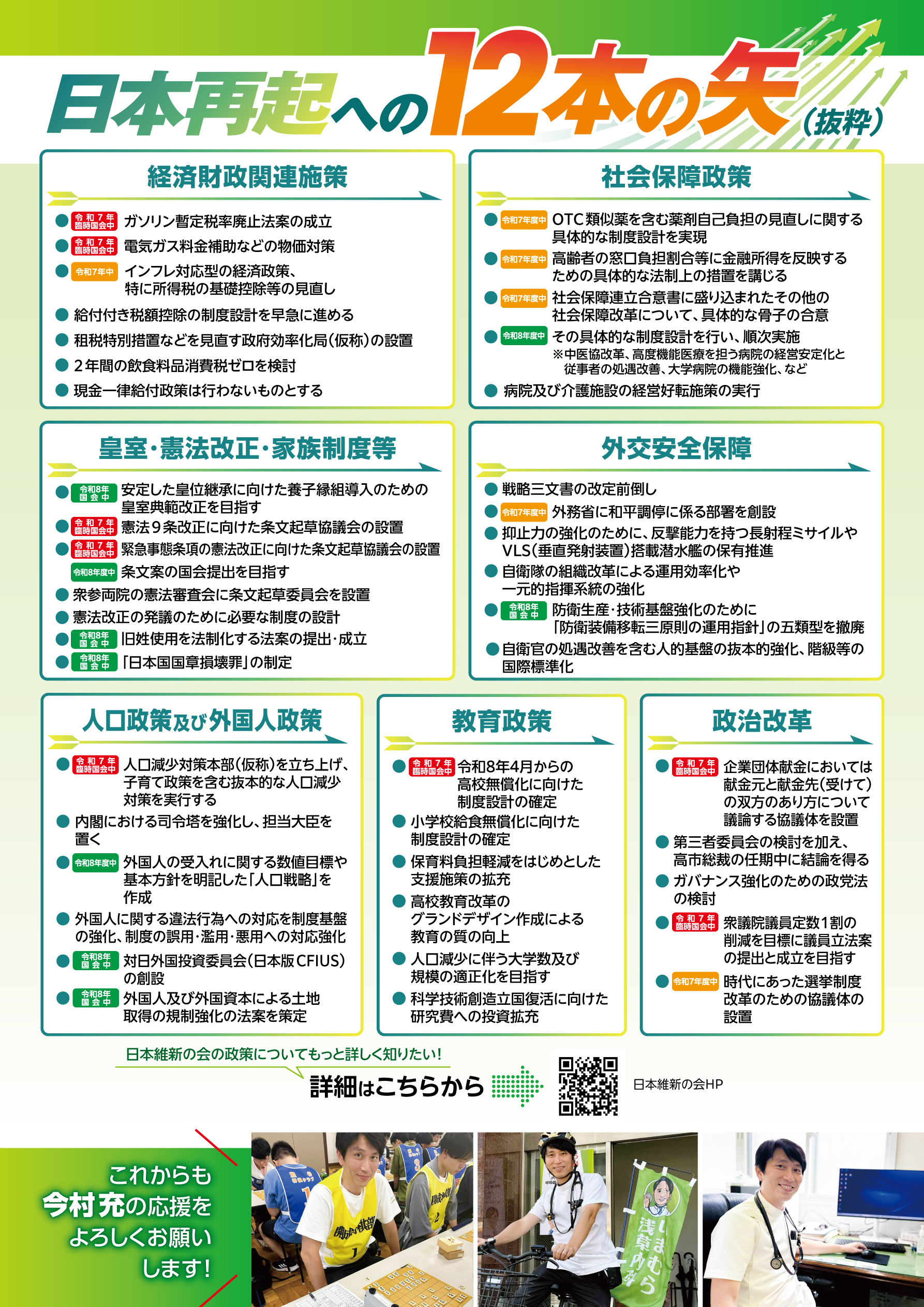 徹底的なムダ削減や既得権益の打破を通じて、全世代が安心できる社会保障制度の確立や経済の活性化、次世代投資を大胆に進めます。